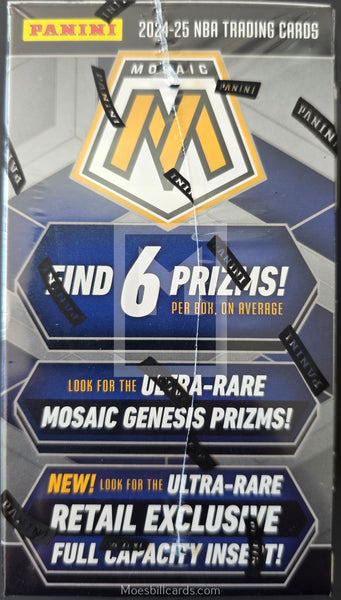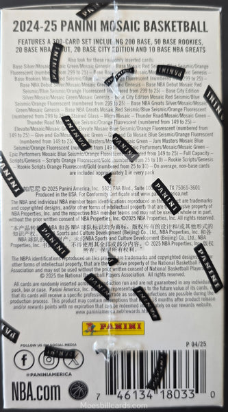 - 2024/25 Panini Mosaic Basketball Blaster features a 300 card set including 200 Base, 50 Base Rookies, 20 Base NBA Debut, 20 Base City Edition and 10 Base NBA Greats!