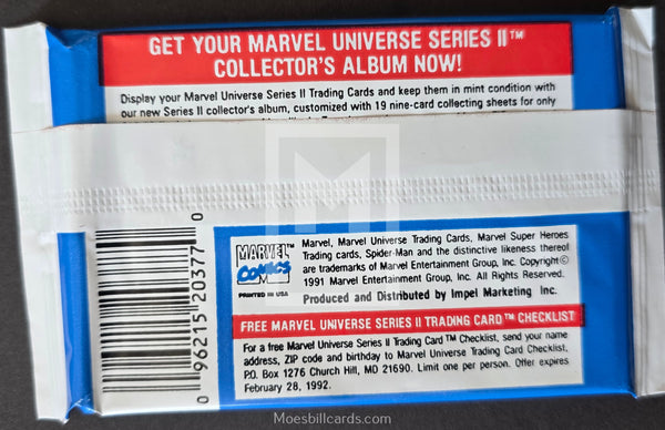 Marvel Universe Series 2 Factory Sealed Trading Card Pack set. The pack fronts feature Wolverine, Spiderman and The Incredible Hulk.
