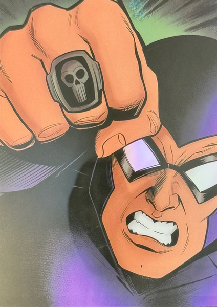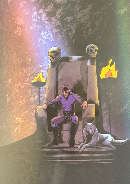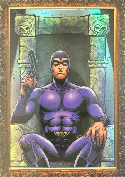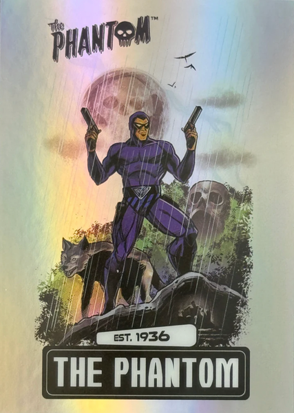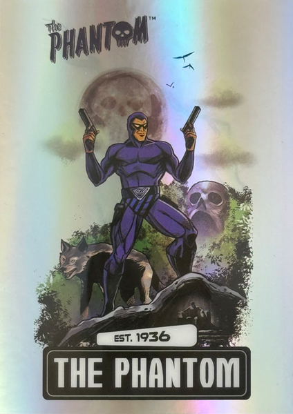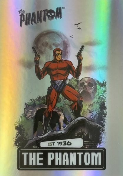 Deep in the jungles of Bangalla, The Ghost Who Walks is said to hunt evil in its many forms. Adorned in the colors of the demon god of Wasaka, The Phantom dwells in his skull cave, accompanied by the wolf, Devil, and the horse, Hero. The Phantom bears two rings to mark those who venture into his lands. The Good Mark, to denote those who are under his protection. The Evil Mark to brand those who will feel his wrath. Saturday Morning Cards The Phantom is an Officially Licensed Product that depicts several key elements of The Ghost Who Walks.